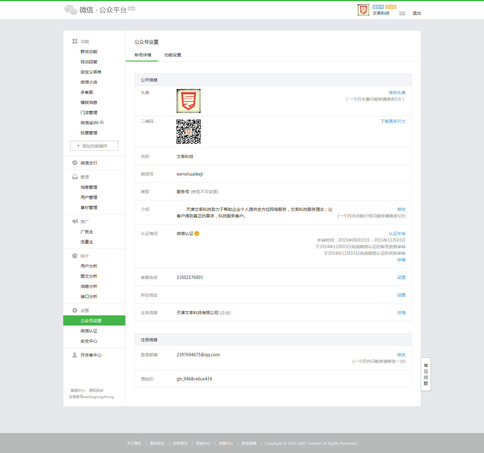 當(dāng)微信公眾號的粉絲達到一定的數(shù)量后在申請認(rèn)證,這樣更有利于品牌的建設(shè),也方便企業(yè)推送信息和解答消費者的疑問,更重要的是可以借此免費搭建一個推廣平臺,但記得將您公眾帳號的頭像更換為企業(yè)LOGO或者店鋪的招牌,企業(yè)信息和相關(guān)介紹一定要填寫詳細(xì)、仔細(xì)。如:天津網(wǎng)站建設(shè)-文率科技。