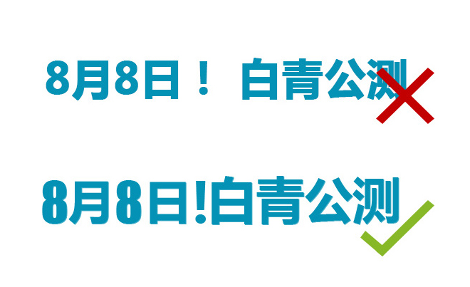 上圖打叉的是我們經(jīng)常忽略的小細(xì)節(jié),用系統(tǒng)默認(rèn)字體的大小打完專題,你會(huì)發(fā)現(xiàn)其實(shí)中文和英文的大小是不一樣的,上圖數(shù)字“8”相比較“月”和“日”明顯略小,這樣,標(biāo)題會(huì)有種上下起伏的感覺(jué),不穩(wěn)當(dāng),第二個(gè)是字的間距,默認(rèn)打完嘆號(hào)離文字過(guò)遠(yuǎn),直接斷開(kāi)了2句話,有必要去調(diào)整下字的間距,調(diào)整后字號(hào)也變得更大空間得到合理運(yùn)用!