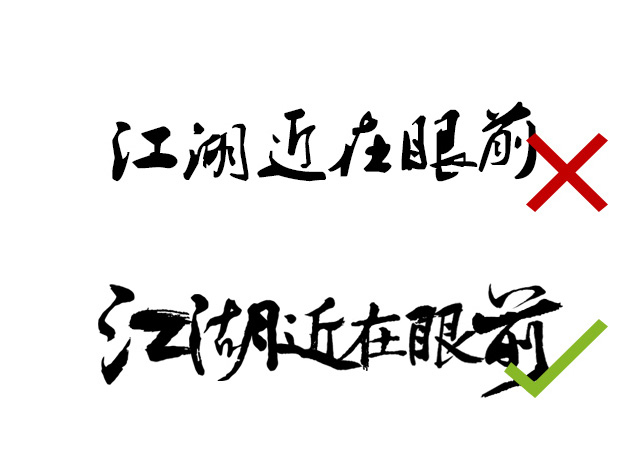 錯(cuò)誤的示意里我們選用了一款常用的書(shū)法字體,當(dāng)然結(jié)果是不理想的,也許項(xiàng)目會(huì)反饋你不夠大氣,無(wú)論在筆觸上,字形上都不是一個(gè)很好的選擇,但是現(xiàn)有的字體無(wú)法滿足你的要求,怎么辦,你可以利用一些在線書(shū)法生成一些毛筆字,但是要注意的是生成的很多字在筆觸粗細(xì)上都不一樣,很容易讓你幾個(gè)字放在一起看著很別捏,如果你沒(méi)有很好的書(shū)法基礎(chǔ),你需要多下載一些書(shū)法筆觸,找出一些字特點(diǎn)并移植到你選中的另外幾個(gè)字上,在適當(dāng)?shù)牡胤郊哟止P觸,這也是一個(gè)慢慢磨的過(guò)程,但是能提高不少作品的品質(zhì)感!