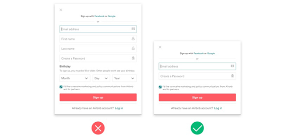 如:Airbnb的注冊(cè)表單,允許用戶通過(guò)郵箱進(jìn)行注冊(cè),但需要一并填寫姓名和生日,其實(shí)姓名和生日并不會(huì)影響用戶對(duì)網(wǎng)站進(jìn)行瀏覽,并且涉及到個(gè)人隱私,用戶可能并不愿意在不熟悉產(chǎn)品的情況下就填寫,所以沒(méi)有必要在注冊(cè)的過(guò)程中進(jìn)行填寫。在注冊(cè)的時(shí)候,只需要填寫郵箱和密碼,而姓名和生日在需要時(shí)在進(jìn)行完善體驗(yàn)會(huì)更好。