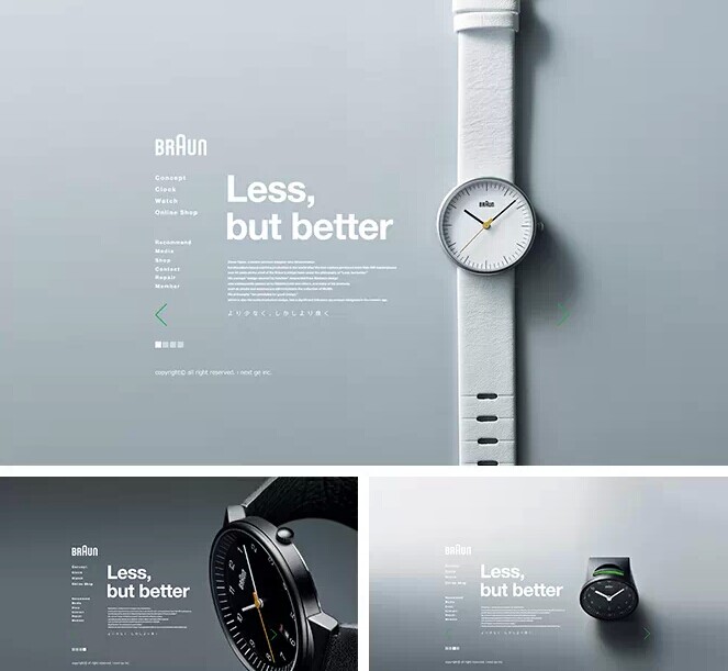 例如:“獸人必須死”首發(fā)引導(dǎo)頁(yè)面,周圍大面積留白,并結(jié)合簡(jiǎn)潔的排版,讓頁(yè)面模塊之間區(qū)分明顯,視覺(jué)集中,很好的給用戶引導(dǎo),給人一種精致和輕松感。例如:BRAUN博朗,整個(gè)頁(yè)面,簡(jiǎn)潔的圖片與文字的排版,讓視線非常集中,這樣用戶快速的將注意力集中到內(nèi)容上去,非常符合他們的主題“Less,but better”,給人留下回味、想象的空間。