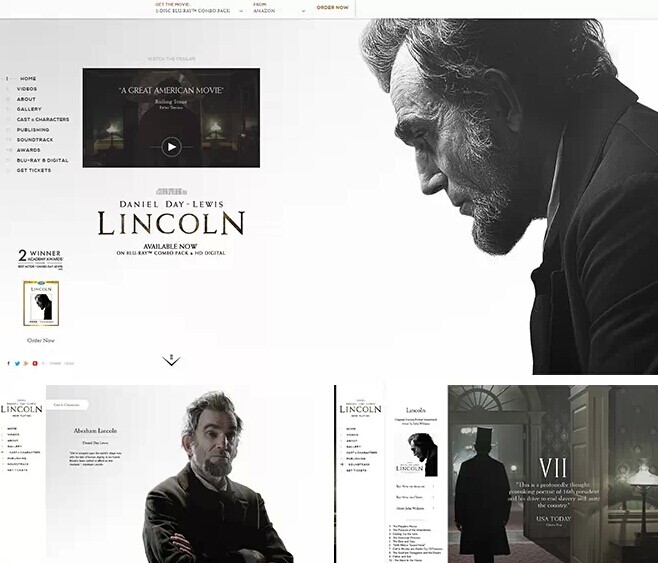 例如:LINCOLN電影網(wǎng)站,運(yùn)用最常用的黑白兩種顏色搭配,讓網(wǎng)頁(yè)如此簡(jiǎn)約大方,給人留下無(wú)限想象空間。