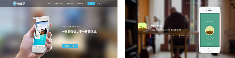 二、目前,一些抽象隱晦的、大尺寸的、虛化或模糊的圖也隨處可見。但是使用虛化或模糊圖的情況會有些復(fù)雜。它只有在圖片本身品質(zhì)很好的情況下才會帶來好的效果,如果為了掩飾圖片質(zhì)量的低劣而去虛化,效果會適得其反。所以我們必須得清楚為什么要把圖片虛化,比如天津網(wǎng)站設(shè)計——文率科技做的微瓶子這個網(wǎng)站需要非常明顯的虛化后才有更好的效果,而Forest 這個網(wǎng)站只需要把人的寫實背景輕微虛化就可以了。