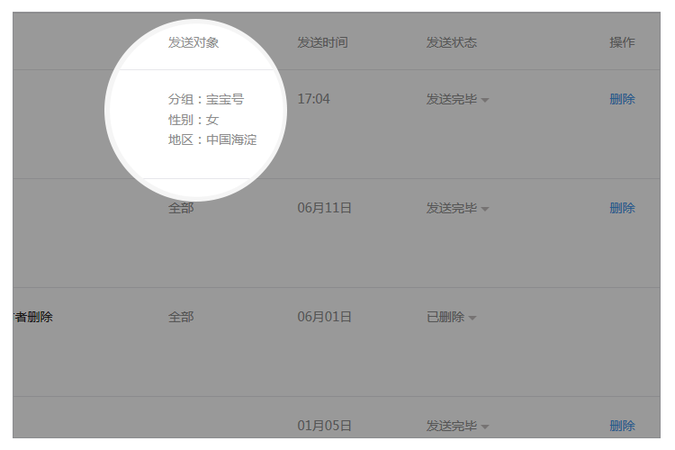 點(diǎn)擊“群發(fā)功能”-“已發(fā)送”可查看已群發(fā)消息,新增該消息對(duì)應(yīng)的發(fā)送對(duì)象的分組、性別和地區(qū)信息。