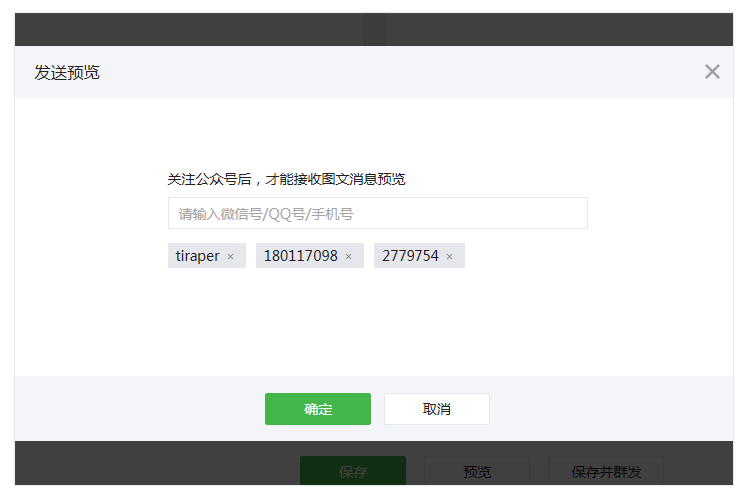 編輯圖文消息時(shí),點(diǎn)擊“預(yù)覽”按鍵,除可輸入微信號(hào)發(fā)給需要預(yù)覽的微信用戶外,新增支持已綁定微信號(hào)的手機(jī)號(hào)和QQ號(hào)。