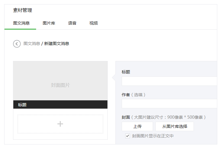進(jìn)入“素材管理”頁(yè)面可直接新建圖文消息,運(yùn)營(yíng)者無(wú)須決定新建單圖文或多圖文。