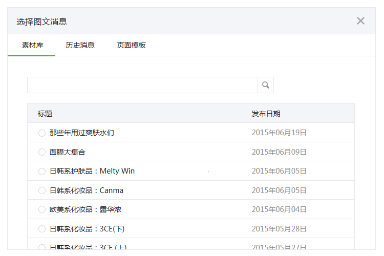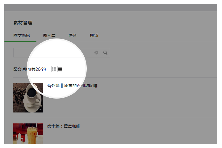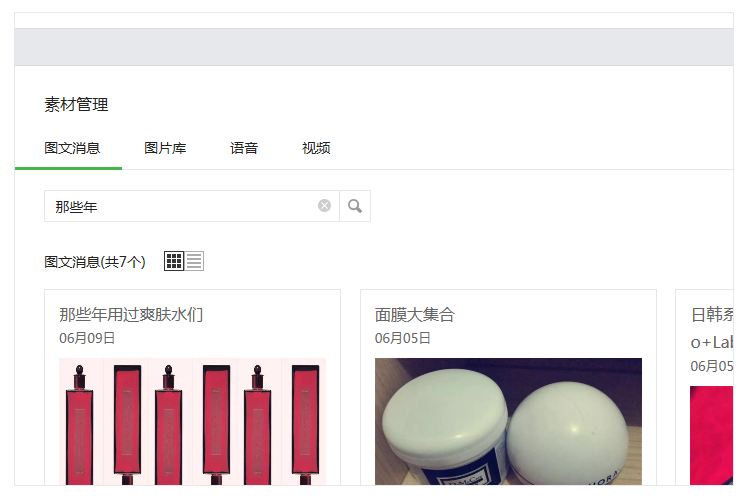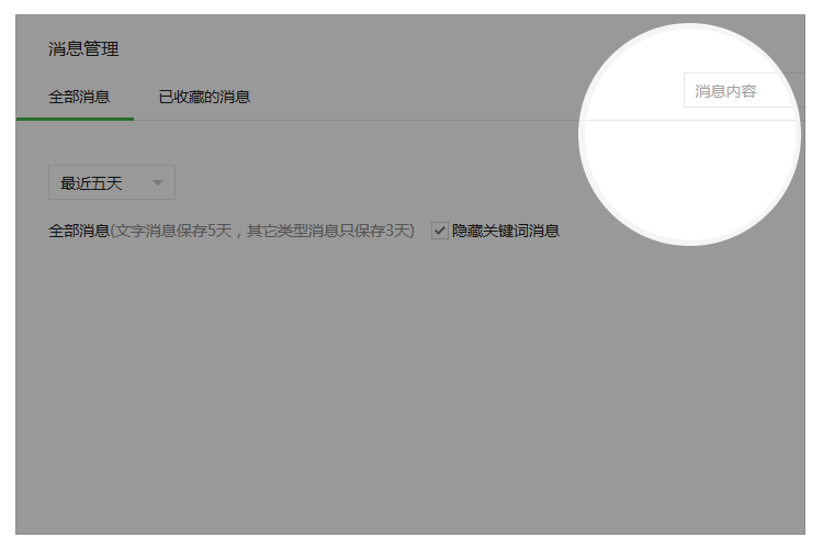 除用戶管理的搜索功能外,素材庫(kù)圖文消息和消息管理的搜索功能體驗(yàn)上保持一致,輸入框內(nèi)提示已支持的搜索內(nèi)容。