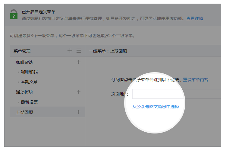 三、自定義菜單:內(nèi)鏈支持歷史消息和頁(yè)面模版
