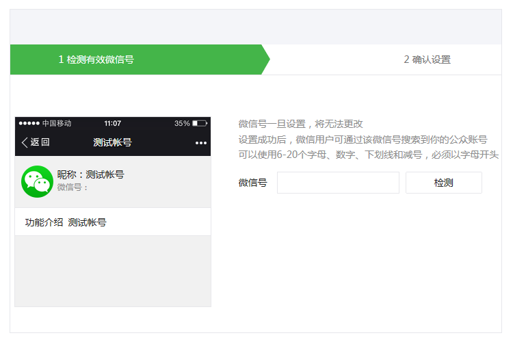 當(dāng)新帳號(hào)信息審核通過(guò)后,可在“公眾號(hào)設(shè)置”進(jìn)行微信號(hào)設(shè)置。運(yùn)營(yíng)者可先檢測(cè)預(yù)設(shè)的微信號(hào)是否可用,若可用再進(jìn)行下一步操作。此外,設(shè)置微信號(hào)時(shí),運(yùn)營(yíng)者直接可見微信內(nèi)該公眾帳號(hào)的微信號(hào)展示效果,提升用戶對(duì)微信號(hào)的理解。