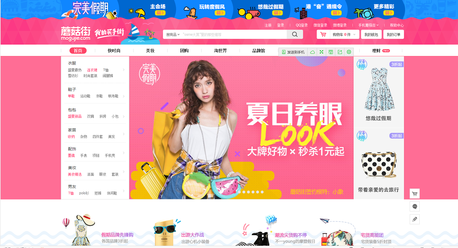 蘑菇街是目前國內(nèi)最大的女性分享導購網(wǎng)站,網(wǎng)頁設計大多選用暖色調(diào)為主體色彩,而粉色最為主要的設計色調(diào)之一,給人以清新、自然、溫暖地感覺,很大程度上勾起人們的購物欲望,希望能面向用戶群擴大。
