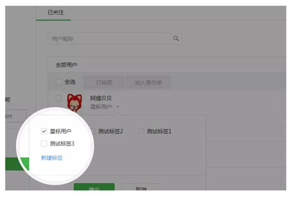 運(yùn)營(yíng)者可登錄公眾平臺(tái)后臺(tái),點(diǎn)擊左側(cè)菜單“用戶(hù)管理”后管理已關(guān)注用戶(hù),點(diǎn)擊其中一個(gè)用戶(hù)右側(cè)的“標(biāo)簽”小角標(biāo)可彈出復(fù)選框快速為該用戶(hù)添加標(biāo)簽,且添加標(biāo)簽復(fù)選框內(nèi)已支持直接新建標(biāo)簽。