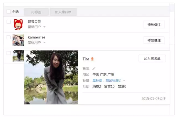 本期新增消息數(shù)、留言數(shù)和贊賞數(shù)等互動(dòng)數(shù)據(jù),且顯示用戶(hù)關(guān)注時(shí)間和支持查看用戶(hù)頭像大圖,有利于拉近運(yùn)營(yíng)者與用戶(hù)的距離。