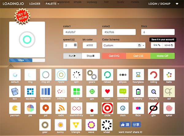 Loading.io網(wǎng)站是一個屬于加載動畫生成的網(wǎng)站,如果目前你正在從事app網(wǎng)站的設(shè)計和研發(fā),那么勢必需要為你的app,網(wǎng)站或項目創(chuàng)建一個加載動畫,若目前你正因為這事而頭疼的惡化,那么不妨來Loading.io網(wǎng)站,它可以幫助你生成一個你最喜歡的,有SVG、CSS和GIF導(dǎo)出功能,在一定的程度上幫您節(jié)省一部分工作時間,提升工作的效率。