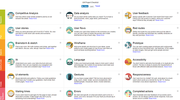 當(dāng)你在工作中創(chuàng)建并開始了一個UX項目的時候,你必須得保證每一步都做得非常的到位,保證你在整個過程中不忘記任何事情,對于每一個細(xì)節(jié)的把控都非常的到位,UXchecklist將會非常有效的幫助你列舉出你正在進(jìn)行著的步驟,這樣的話在一定的程度上它能夠幫助你贏的一些晚上的睡眠時間哦!