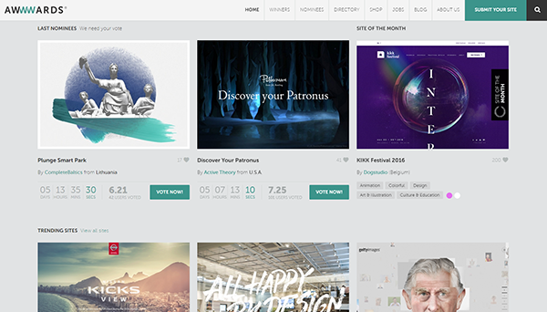 Awwwards是一個專門為設(shè)計精美的網(wǎng)站以及富有創(chuàng)意的網(wǎng)站頒獎的網(wǎng)站,Awwwards上的獲獎網(wǎng)站來自全世界優(yōu)秀的網(wǎng)頁設(shè)計師之手,網(wǎng)站每天評選出一個“Site of the Day”。如果您想增加自己的視野,想提升自己的設(shè)計水平,想學(xué)習(xí)國外優(yōu)秀設(shè)計網(wǎng)站的設(shè)計思路,Awwwards一定可以幫到你,在這里你可以找到大量的實例。