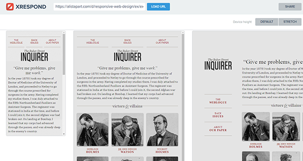 Xrespond絕對(duì)對(duì)得起“虛擬設(shè)備實(shí)驗(yàn)室”,這個(gè)稱號(hào),通過Xrespond 打開網(wǎng)頁(yè),你可以看到它在不同屏幕尺寸下的樣子,整個(gè)布局是橫向的,所以你需要橫向滾動(dòng)頁(yè)面才能看到它所有的樣子。屏幕上方的標(biāo)簽會(huì)標(biāo)識(shí)出它是為什么設(shè)備所匹配的,在下拉框當(dāng)中能夠選出不同品牌不同型號(hào)的智能手機(jī)、平板和筆記本屏幕,以預(yù)覽效果。