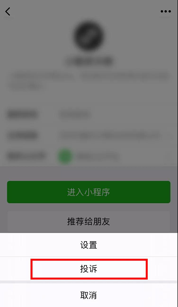進入小程序介紹頁,點擊右上角“…”選擇投訴