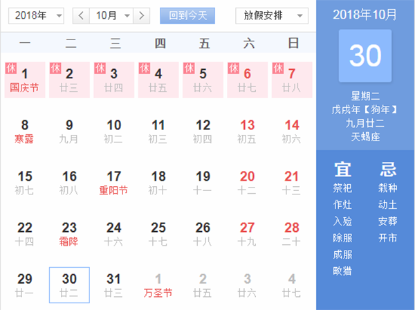 從2017年10月1日至10月7日,放假調(diào)休7天,10月8日(星期一)正常上班。9月30日周日正常上班。