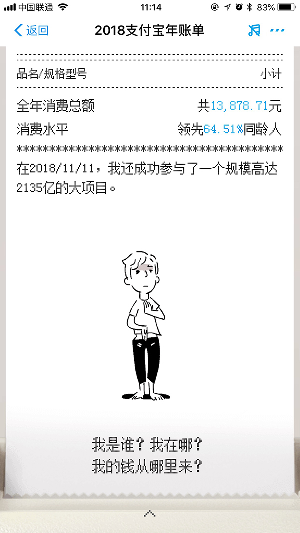 第二頁賬單統(tǒng)計了你去年一年的消費總額,以及在全國用戶中的水平,這簡直就是一年中最為富有的時刻。
