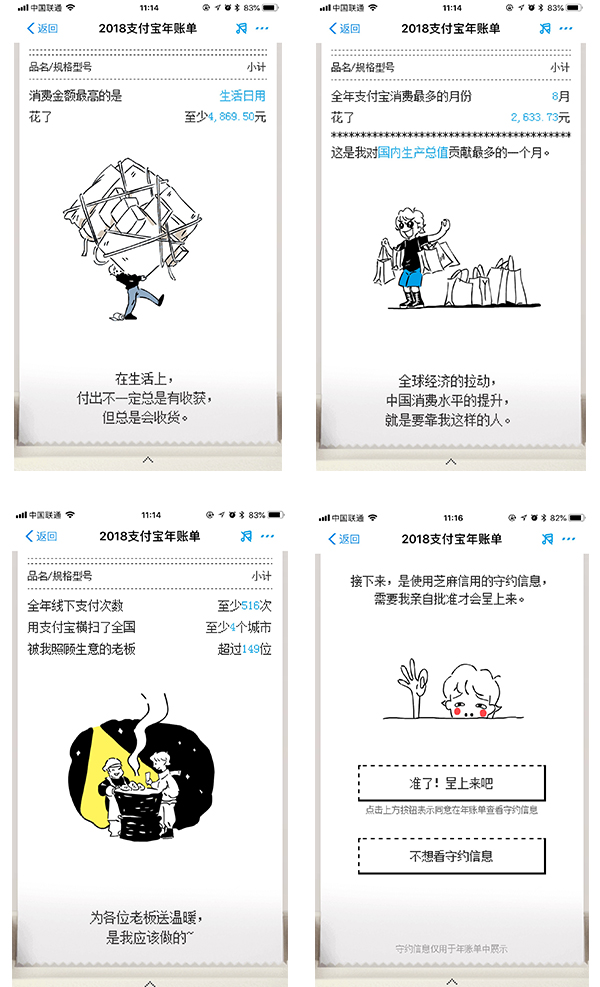或許賬單會遲到,但卻永遠不會缺席。上周,支付寶年賬單在微信朋友圈開始雙刷屏,自覺花錢如流水的網(wǎng)友,紛紛以各種“不忍直視!”的詼諧表達來調(diào)侃自己。不過,今年的支付寶賬單與往年有所不同,2018年度支付寶賬單采用了流水小票概念設(shè)計,看上去相當(dāng)有創(chuàng)意,整個賬單就像一張從打印機中慢慢打印出來的購物小票,每一頁都配有相應(yīng)的簡筆畫。