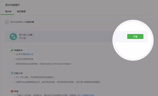 登錄微信公眾平臺-> 點擊左側(cè)的“添加功能插件”-> 選擇“掃一掃”-> 點擊“開通”。