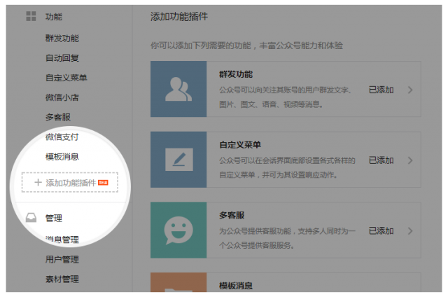 每個(gè)公眾號都可以在添加功能插件頁面,看到該帳號能申請的所有功能。