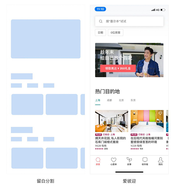 所謂的留白其實(shí)是指頁面元素間或包圍頁面元素的空白空間,雖然這種手法可能會(huì)被認(rèn)為浪費(fèi)空間,但不得不說,目前大部分app的首頁都是采用留白分割,如圖: