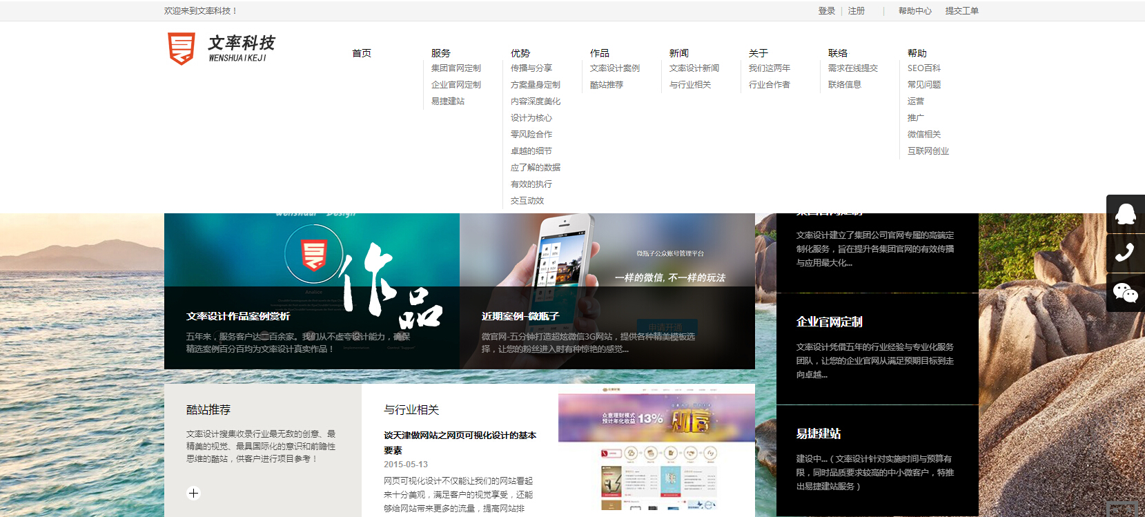 網(wǎng)站導(dǎo)航的設(shè)計(jì)要么千篇一律,沒(méi)有絲毫新意;要么千奇百怪,讓人無(wú)法理解;專(zhuān)注網(wǎng)站的網(wǎng)站導(dǎo)航設(shè)計(jì)應(yīng)該站在客戶和企業(yè)的角度之上綜合進(jìn)行考慮。首頁(yè)banner部分可讀信息過(guò)少等這些問(wèn)題從優(yōu)化角度分析都是網(wǎng)站制作所忽視的問(wèn)題。大家可以看下天津網(wǎng)站制作——文率科技的網(wǎng)站導(dǎo)航和首頁(yè)banner的設(shè)計(jì)簡(jiǎn)單大方可讀信息多,非常有利于用戶體驗(yàn),同時(shí)很容易被百度蜘蛛抓取。