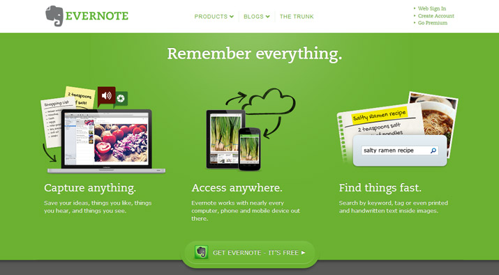 Evernote屬于分類筆記應(yīng)用類中最優(yōu)秀的app設(shè)計工具,它能夠在不同平臺上工作,如:智能手機、平板電腦、或者通過Cloud在臺式電腦上使用,只要是用它保存的東西,你可以在任何時間任何地點進行存取。同時,再加上Web Clopper和Skitch這樣的插件,你可以將喜歡的網(wǎng)頁保存到個人文件夾中,這是創(chuàng)建書簽和閱讀清單的最佳工具。