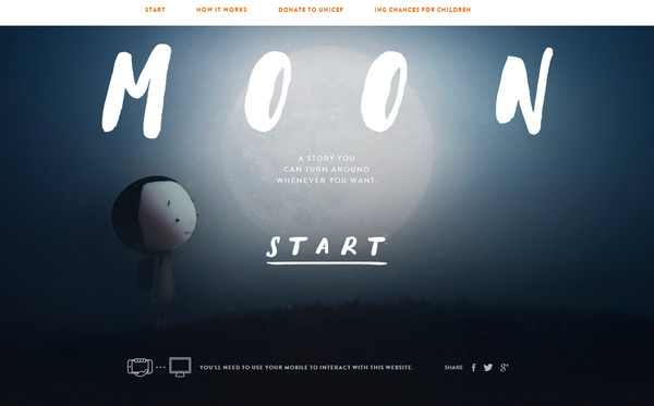 Moon這個腦洞大開的網(wǎng)頁,被推薦到Awwwards上時曾得到許多設(shè)計師的盛贊。設(shè)計師以講故事的形式來呈現(xiàn)尖銳的社會問題,巧妙地讓可愛的藝術(shù)感染力同人文關(guān)懷充分結(jié)合到一起,發(fā)人深省。