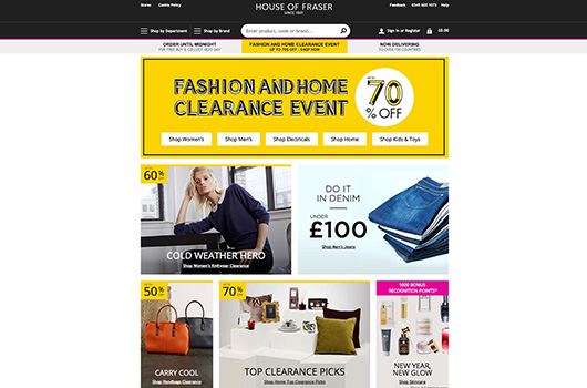 隱藏式菜單在電商類網(wǎng)站中的作用是非常重要的,巧妙的利用隱藏式菜單能夠清理電商網(wǎng)站雜亂的版面,最初它們是為移動端設(shè)計的,但現(xiàn)在也越來越多用在桌面端的設(shè)計中。2015年,許多在線銷售商在大大小小的屏幕上都使用了隱藏式導(dǎo)航菜單,節(jié)省了大量屏幕空間,這個趨勢在2016還會持續(xù)增長。如今,互聯(lián)網(wǎng)中很多知名在線商城都使用了隱藏式菜單,如:House of Fraser。