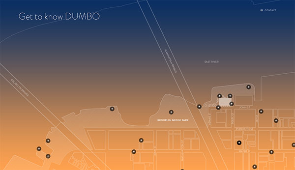 這是Brooklyn DUMBO一款公寓群的著陸頁(yè)。這款網(wǎng)站令人驚奇的地方,是漸變色會(huì)在一天中隨著時(shí)間改變深度,這款設(shè)計(jì)非常有趣,值得設(shè)計(jì)師借鑒。