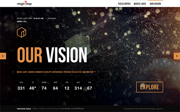 Magic Leap的網(wǎng)頁(yè)背景利用光點(diǎn)和光束形成了一種看似漸變的特別效果,黑色與光束之間的搭配總是顯得大氣又神秘。少量的橙色元素與光束的顏色完美契合,讓瀏覽者既能一眼找到重點(diǎn),背景又不單調(diào)。