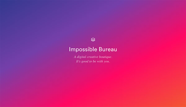 Impossible Bureau的頁(yè)面采用了非常鮮明、反差強(qiáng)烈的漸變色!很酷的是,每當(dāng)頁(yè)面加載完成,其他元素在上方出現(xiàn),頁(yè)面的濃烈與戲劇性并沒(méi)有被沖淡。
