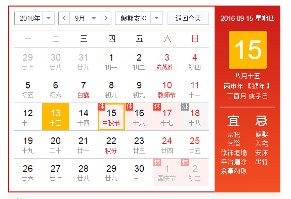 1、放假時(shí)間:2016年9月15日至9月17日放假,共3天。9月15日(星期四,農(nóng)歷中秋節(jié)當(dāng)日)為國(guó)家法定節(jié)假日;9月17日(星期六)公休;9月18日(星期日)公休調(diào)至9月16日(星期五);9月18日(星期日)照常上班。