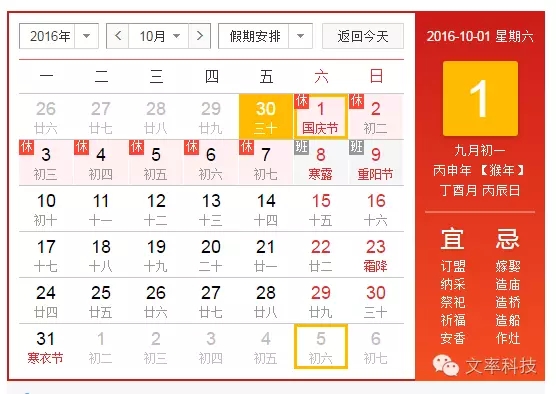 根據(jù)《國務(wù)院關(guān)于2016放假安排表的通知》,天津網(wǎng)站建設(shè)-文率科技2016十一放假時(shí)間安排:放假7天,即10月1日至10月7日。10月8號(hào)(星期六),10月9號(hào)(星期天)正常上班。
