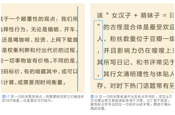 如:中文和英文混排,為使中文和英文和諧自然地結(jié)合,需要把英文的字號設(shè)定得比中文字號大一些。還有左右對齊,必須決定是否把標(biāo)點“懸吊”在對齊線之內(nèi)。