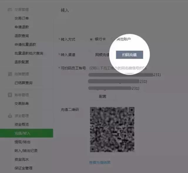 電腦登錄微信支付商戶平臺-交易中心 - 充值轉(zhuǎn)入,選擇轉(zhuǎn)入方式為“掃碼充值”,根據(jù)頁面操作流程進行充值;
