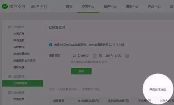 為及時接收到每日交易款結(jié)算提現(xiàn)情況的通知,商戶可以通過電腦登錄微信支付商戶平臺-交易中心-已結(jié)算查詢,點擊“開啟微信推送”,根據(jù)頁面操作流程開通每日交易款結(jié)算情況通知功能;開通后,將于每日早上10點前通過微信支付商戶助手公眾號接收到前一日結(jié)算情況,以及結(jié)算款自動提現(xiàn)進展。