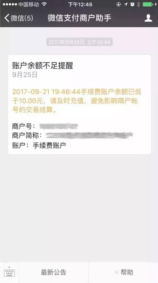 當手續(xù)費賬戶余額低于設置金額時,會通過微信支付商戶助手公眾號下發(fā)賬戶余額不足提醒;