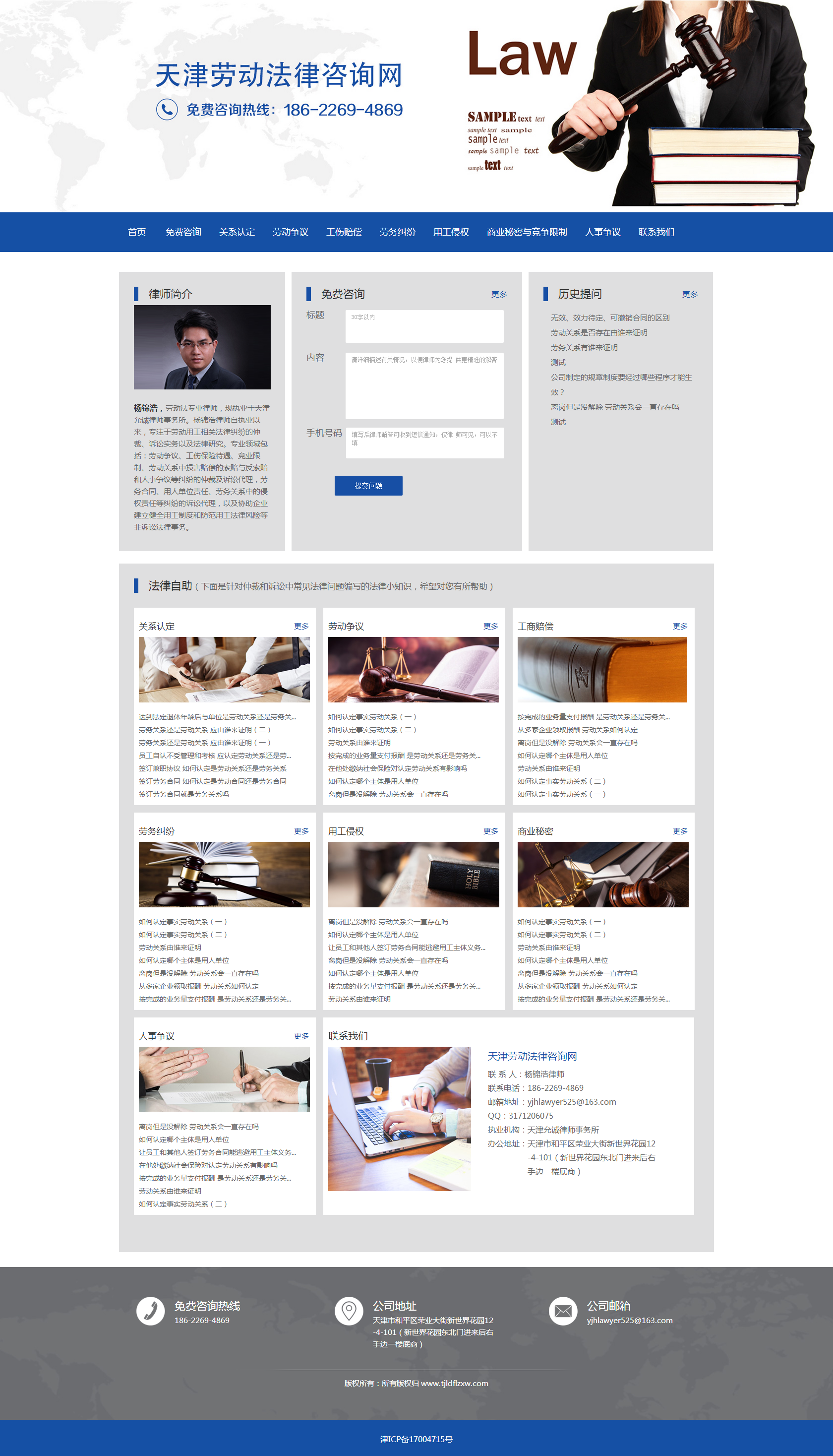 天津勞動(dòng)法律咨詢網(wǎng),是由楊錦浩律師創(chuàng)辦的區(qū)域性法律咨詢類網(wǎng)站,旨在為廣大網(wǎng)友提供勞動(dòng)和用工方面免費(fèi)的法律問(wèn)題解答,以及分享與勞動(dòng)仲裁、訴訟相關(guān)的法律知識(shí)和仲裁、訴訟經(jīng)驗(yàn),使得廣大網(wǎng)友在自主進(jìn)行勞動(dòng)仲裁和訴訟活動(dòng)時(shí)獲得相應(yīng)的法律幫助。